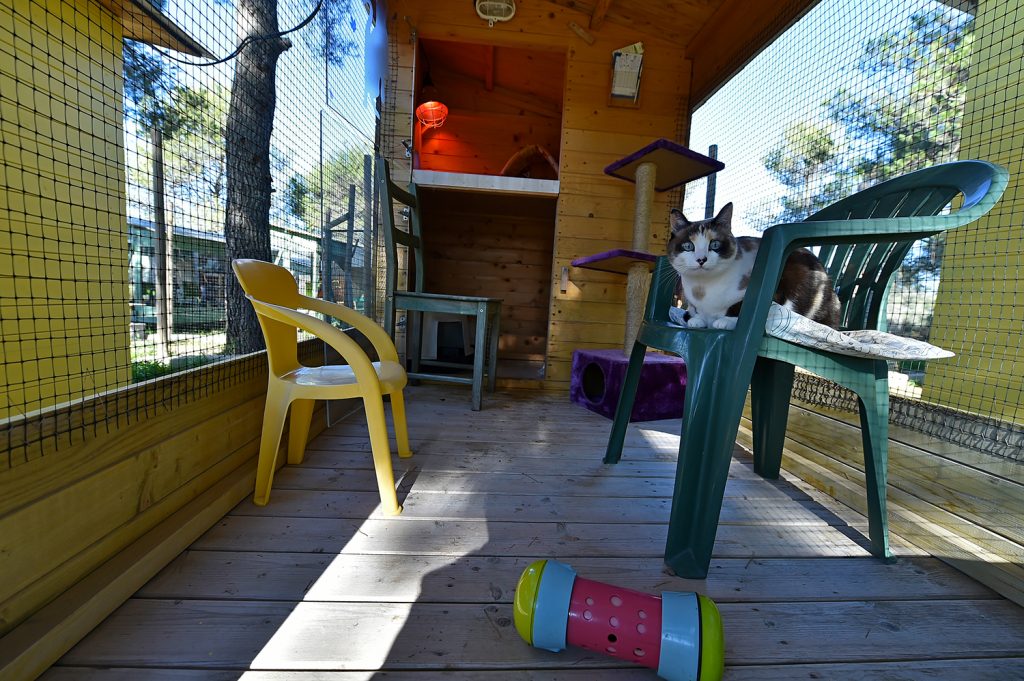 • Les chats (selon leur caractère), à tour de rôle, peuvent accéder à un parc de détente de 70m2 autour de son chalet!